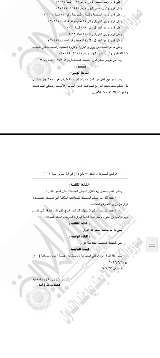 نشرت الجريدة الرسمية قرار وزارة البترول والثروة المعدنية، بتحديد سعر بيع الطن من المازوت بالمواصفات العادية بسعر 6000 جنيه لكل طن تسليم مستودعات التوزيع لصناعات قمائن الطوب والأسمنت وباقي القطاعات والجهات والاستخدامات الأخرى.
