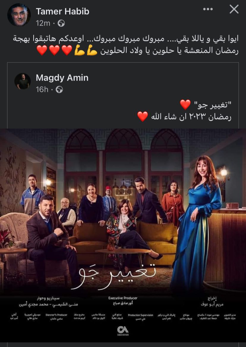 دعم السيناريست تامر حبيب، الفنانة منة شلبي، بعد طرح البوستر الرسمي لمسلسها الجديد الذي يحمل عنوان تغيير جو، المقرر عرضه في الماراثون الرمضاني لعام 2023.
