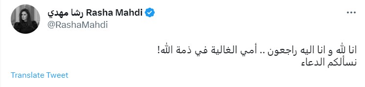 وكتبت رشا مهدي، منشورًا عبر حسابها الشخصي بموقع التغريدات القصيرة تويتر، حيث قالت: إنا لله وإنا إليه راجعون.. أمي الغالية في ذمة الله!، نسألكم الدعاء.