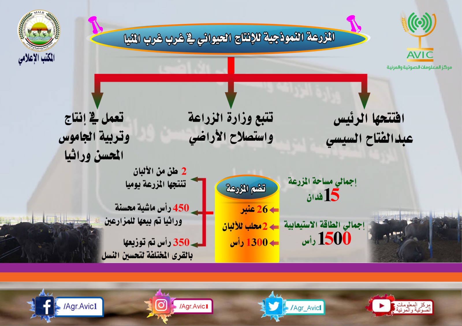 نشر مركز المعلومات الصوتية والمرئية بوزارة الزراعة واستصلاح الأراضي، انفوجرافا، أوضح خلاله أهم المعلومات حول مزرعة الإنتاج الحيواني بمنطقة غرب غرب المنيا لإنتاج وتربية الجاموس المحسن وراثيًا، والتي افتتحها الرئيس عبدالفتاح السيسي أمس، ضمن افتتاحه وتفقده عددا من المشروعات التنموية بالمحافظات، ومشروعات المبادرة الرئاسية حياه كريمة لتنمية الريف المصري.