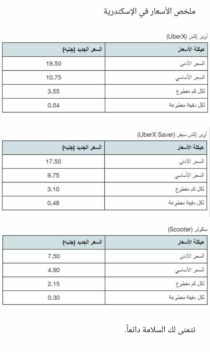 وأخطرت شركة أوبر، عملائها عبر البريد الالكتروني، الإيميل، عن رفع أسعار خدماتها بداية من اليوم الجمعة، مرجعة هذه الزيادة إلى رفع أسعار البنزين بنسب تصل إلى جنيه في اللتر.