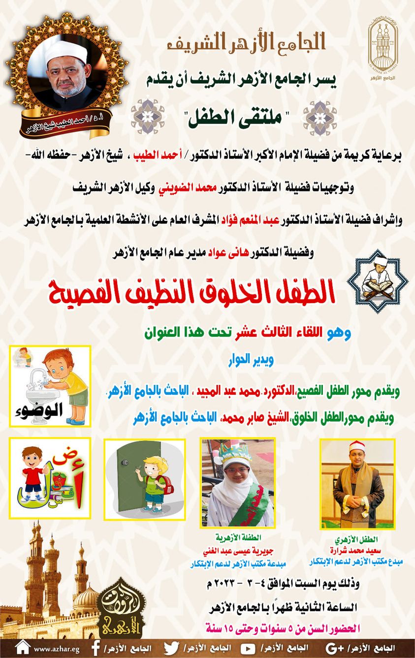 يعقد الجامع الأزهر اليوم السبت الموافق 4 / 3 / 2023، الحلقة الثالثة عشرة من ملتقى الطفل، والذي يأتي تحت عنوان: " الطفل الخلوق - النظيف - الفصيح"، وذلك تحت رعاية الإمام الأكبر الدكتور أحمد الطيب شيخ الأزهر الشريف، وبمتابعة الدكتور محمد الضويني وكيل الأزهر الشريف.