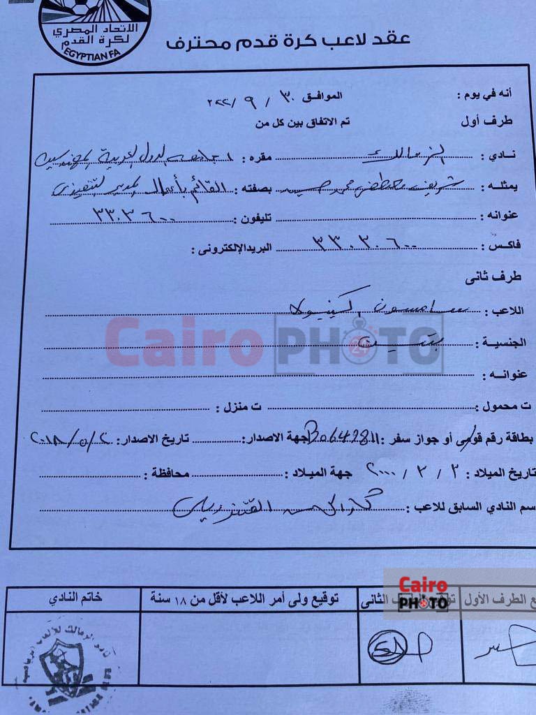 ينشر القاهرة 24، تفاصيل عقد البنيني سامسون أكينيولا مهاجم الفريق الأول لكرة القدم بنادي الزمالك، والقادم إليه هذا الموسم من نادي كراكاس الفنزويلي الذي لم يشارك إلا لدقائق قليلة مع الزمالك حتى الآن، وأحرز هدفًا واحدًا أمام فريق سموحة في الدور الأول.
