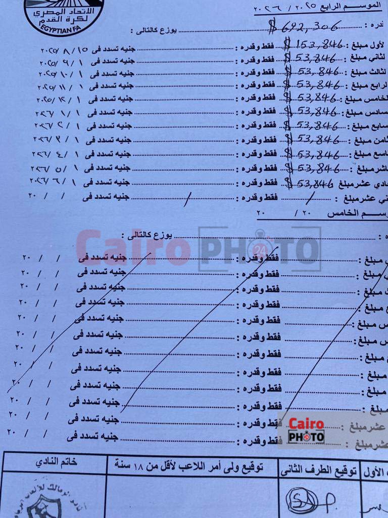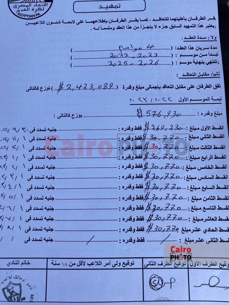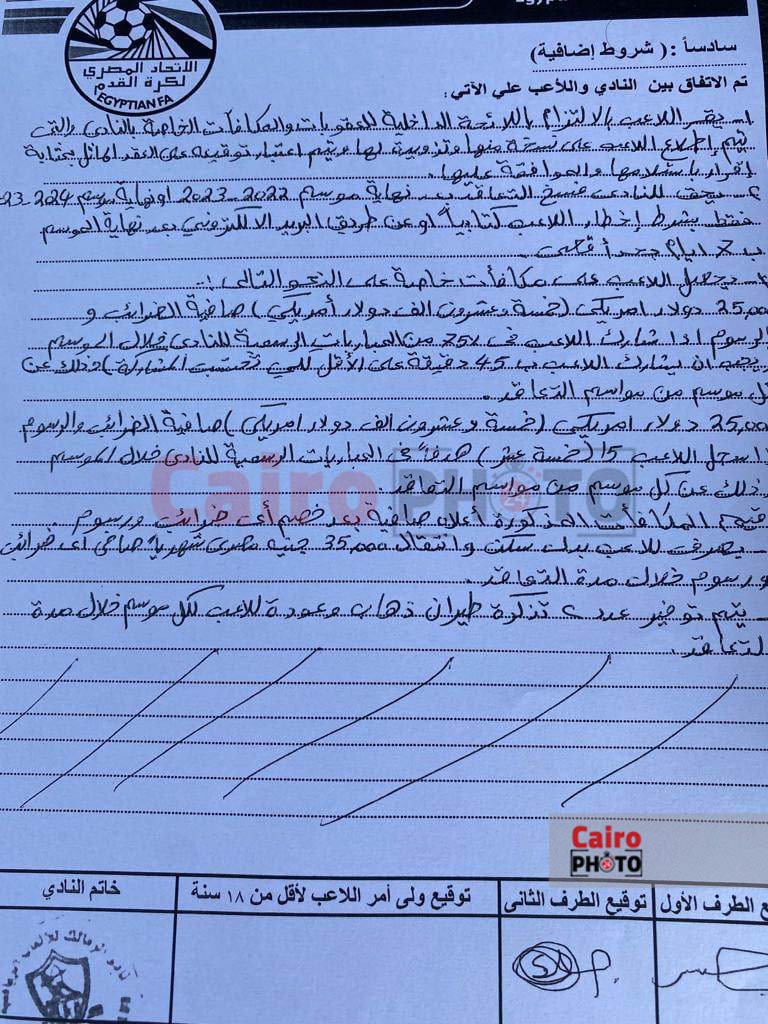 ووضع الزمالك عددًا من الشروط في تعاقد اللاعب؛ حيث يحق للزمالك فسخ التعاقد بعد نهاية الموسم الأول أو بعد نهاية الموسم الثاني، بشرط إخطار اللاعب كتابيًّا أو من خلال الإيميل، وذلك في خلال سبعة أيام من انتهاء الموسم.
