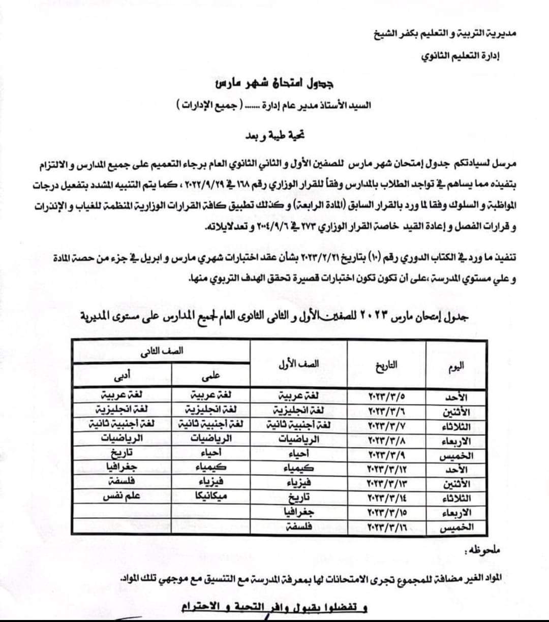 وأكد محمد عبد الله، وكيل وزارة التربية والتعليم بكفر الشيخ، أنه تم إرسال جداول اختبارات شهر مارس 2023 إلى جميع الإدارات التعليمية لنشرها في المدارس، كما تم التنبيه على اتخاذ كل الإجراءات الاحترازية اللازمة، حفاظًا على سلامة الطلاب، واستكمال اليوم الدراسي.
