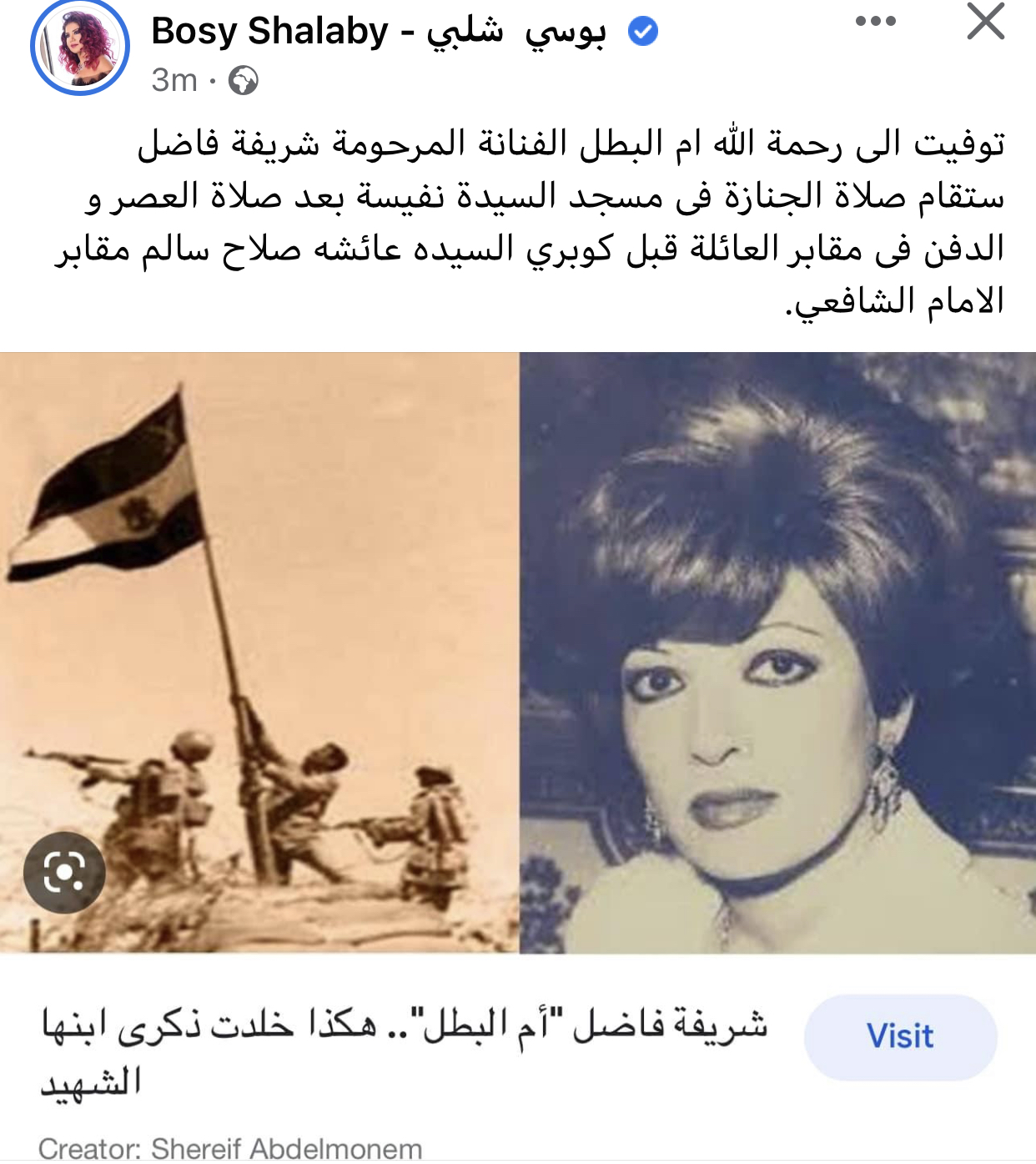 أعلنت الإعلامية بوسي شلبي وفاة الفنانة شريفة فاضل، عن عمر ناهز الـ 85 عامًا.