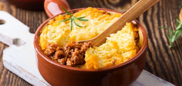 - وأخيرا توضع البطاطس البيوريه في طواجن فخار مدهونة زيت لتملئ نصف الطاجن فقط، ثم توضع طبقة من اللحمة المفرومة ثم يضاف البشاميل ليملئ النصف الآخر.