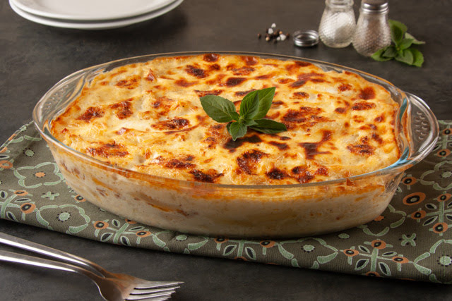 - وأخيرا توضع طبقة من البشاميل، وتزين صينية المكرونة بالجبنة الرومي المبشورة والموتزاريلا والشيدر حسب المتاح، وتدخل الفرن على درجة حرارة 180 درجة حتى تنضج.