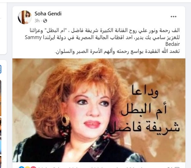 وقالت وزيرة الهجرة، عبر صفحتها الرسمية على موقع التواصل الاجتماعي فيسبوك: ألف رحمة ونور على روح الفنانة الكبيرة شريفة فاضل، أم البطل وعزائنا للعزيز سامي بدير، أحد أقطاب الجالية المصرية في دولة أيرلندا، وتابعت وزيرة الهجرة تغمد الله الفقيدة بواسع رحمته وألهم الأسرة الصبر والسلوان.