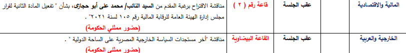 وتناقش لجنة الشؤون المالية والاقتصادية عقب رفع أعمال الجلسة الاقتراح برغبة المقدم من النائب، محمد علي أبو حجازي، بشأن تفعيل المادة الثانية لقرار مجلس إدارة الهيئة العامة للرقابة المالية رقم 105 لسنة 2021.