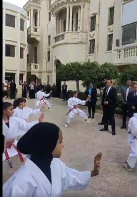كما مارس عدد من طالبات مدرسة مصر الجديدة النموذجية حركة من لعبة الكارتية أمام وزيرا التربية والتعليم والشباب.