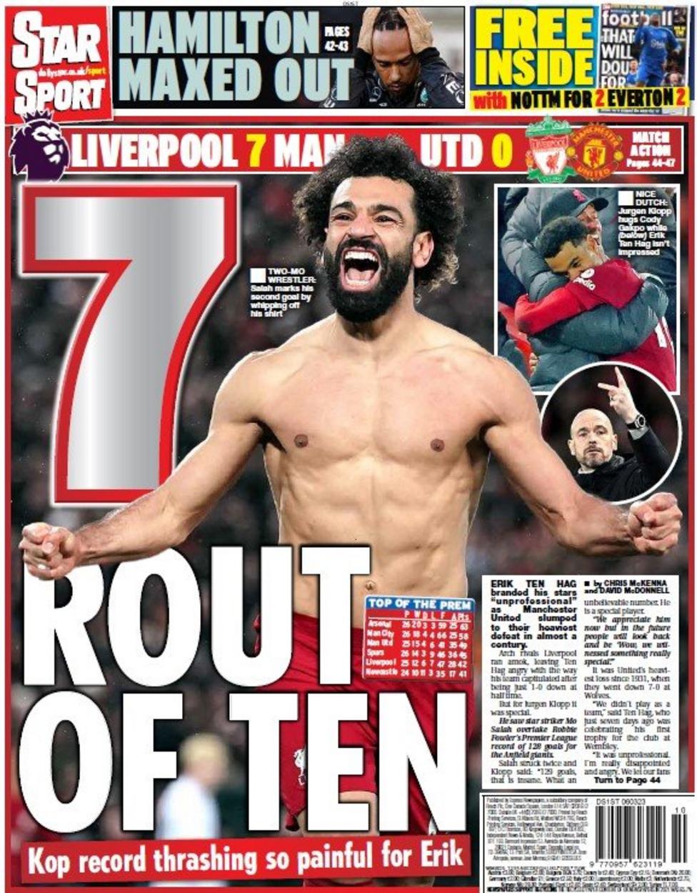 تصدر احتفال صلاح بهدفه أمام مانشستر يونايتد غلاف ديلي إكسبريس مع حسرة إريك تين هاج، وقالت الصحيفة في عنوانها الرئيسي بغلاف اليوم "سبعة" كما أشارت إلى أن محمد صلاح يحتفل بإنجازه التاريخي بتخطي روبي فاولر.