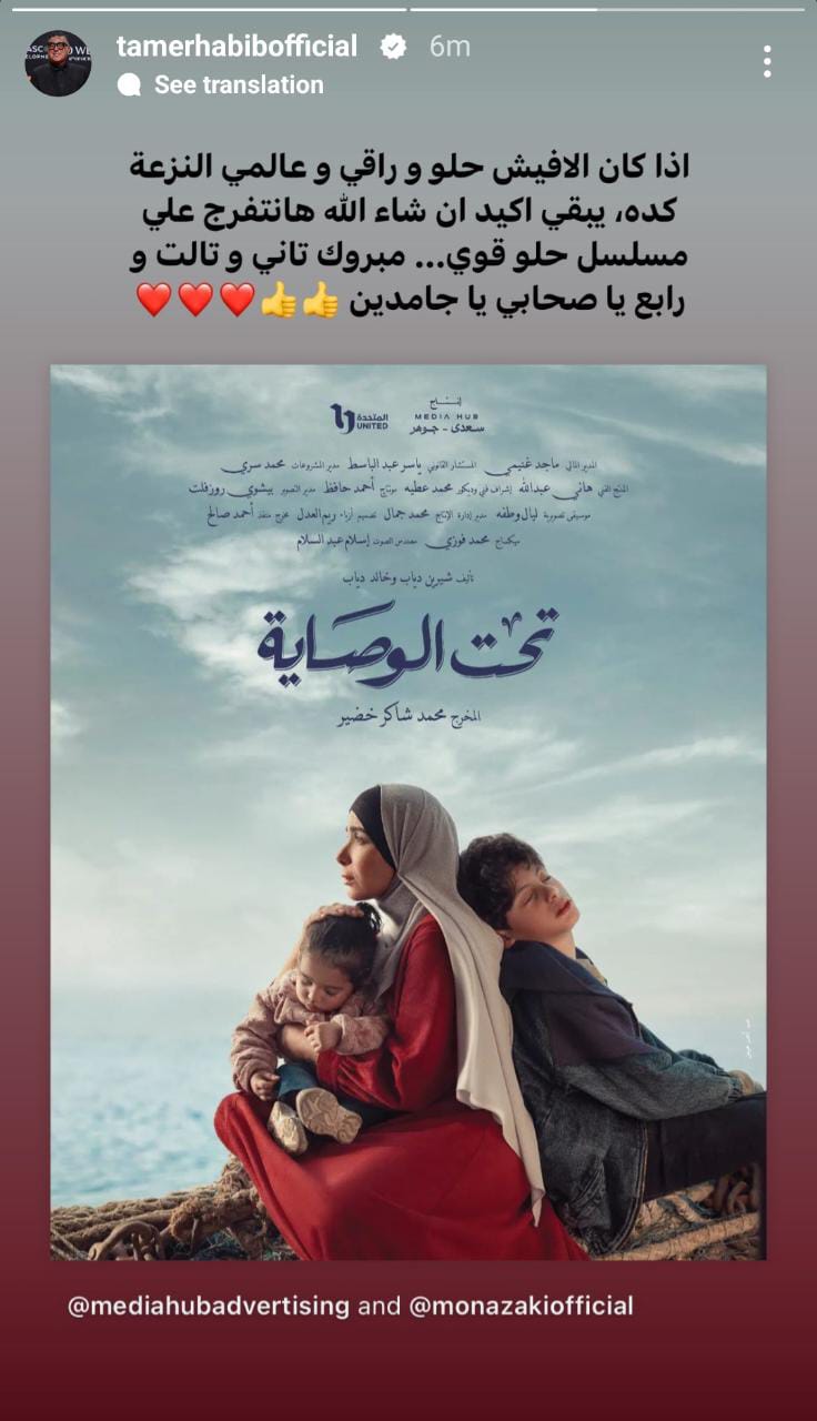 أشاد السيناريست تامر حبيب ببوستر مسلسل تحت الوصاية بطولة الفنانة منى زكي، والمقرر عرضه في السباق الرمضاني 2023.