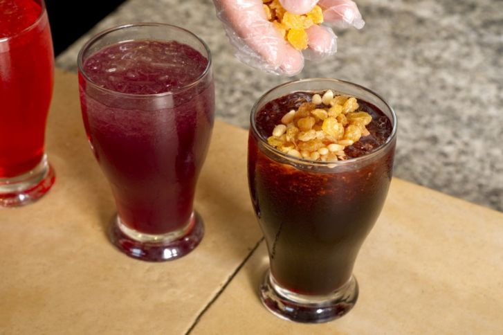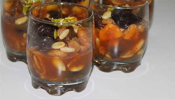 - وفي الخطوة الرابعة يتم خلط ماء البلح مع الفاكهة المجففة ويضاف إليها جوز الهند والزبيب، وتوزع في الأكواب وبألف هنا وشفا.