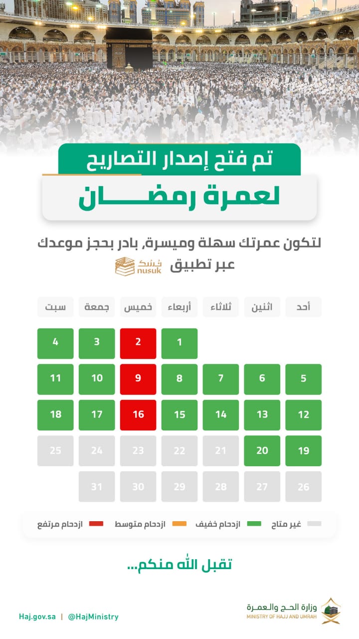 أعلنت وزارة الحج والعمرة بالمملكة العربية السعودية، إتاحة حجز أداء العمرة خلال شهر رمضان المقبل، بداية من اليوم.