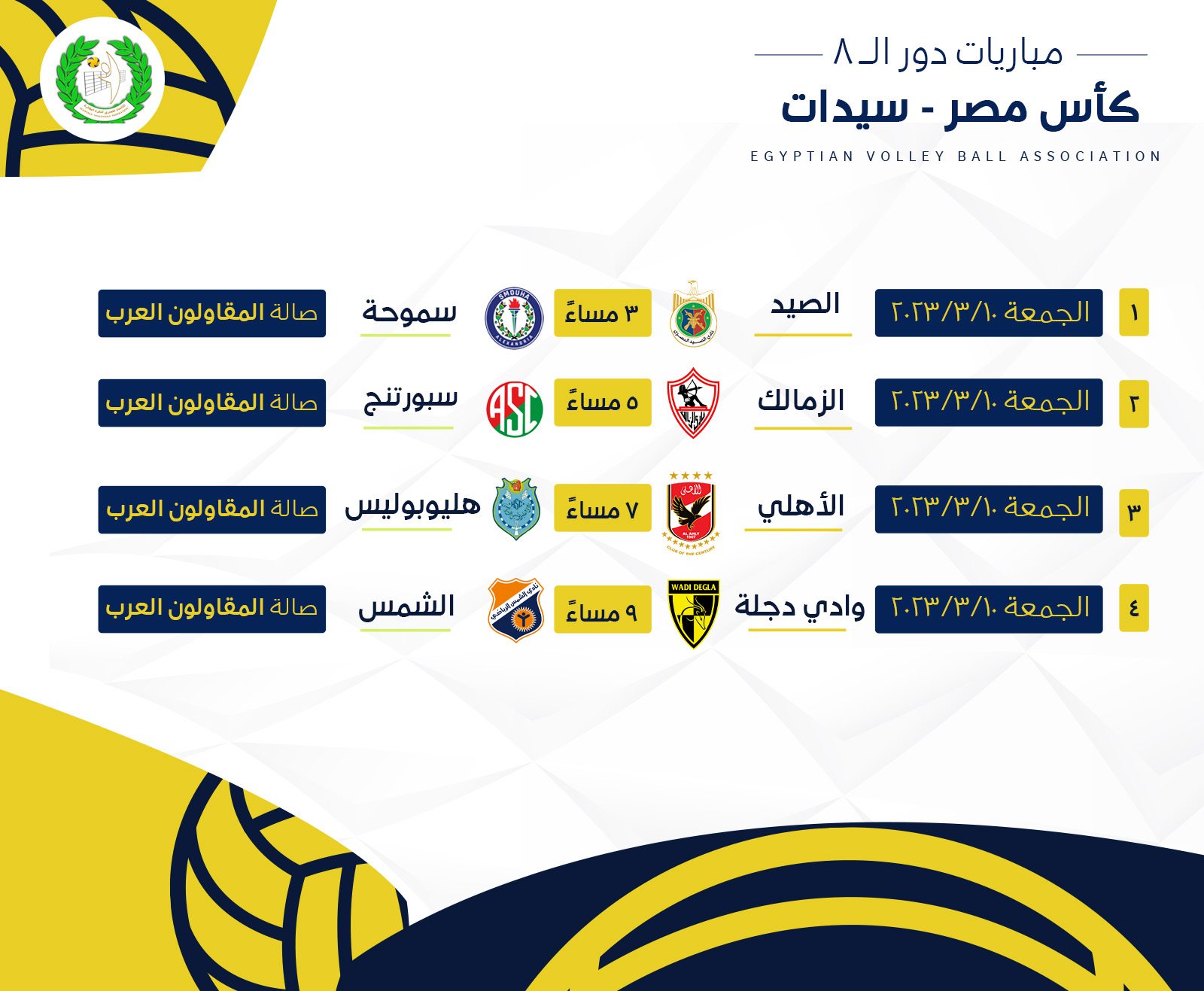 وفي وقت سابق، أعلنت لجنة المسابقات بالاتحاد المصري للكرة الطائرة مواعيد منافسات دور الثمانية لبطولة كأس مصر آنسات للموسم الرياضي 2022-2023.