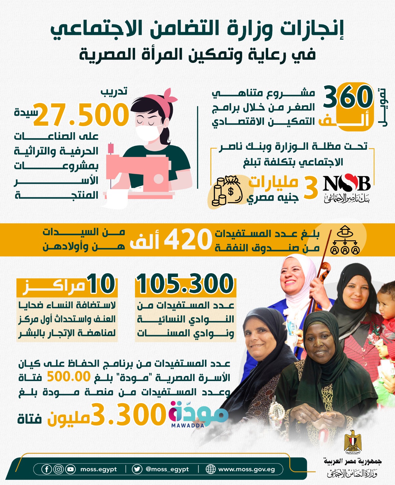 وكشفت التضامن الاجتماعي، عدد المستفيدات من النوادي النسائية ونوادي المسنات، واللاتي وصلت عددهن إلى 105.300 سيدة، فيما جاء عدد المستفيدات من برنامج الحفاظ على كيان الأسرة المصرية مودة بحوالي 500.00 فتاة، أما عدد المستفيدات من منصة مودة وصلوا إلى 300.3 مليون فتاة.