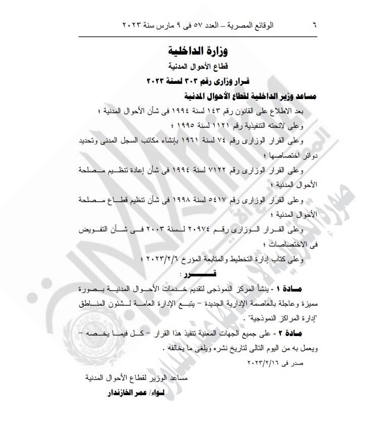 وجاء القرار الذي نشرته الجريدة الرسمية: بعد الاطلاع على القانون رقم 143لسنة 1994 في شأن الأحوال المدنية ؛وعلى لائحته التنفيذية رقم 1121 لسنة1995؛ وعلى القرار الوزاري رقم 74 لسنة 1961 بإنشاء مكاتب السجل المدني وتحديد الحميد دوائر اختصاصها ؛ وعلى القرار الوزاري رقم7122 لسنة 1994 في شأن إعادة تنظيم مصلحة الأحوال المدنية ؛ وعلى القرار الوزاري رقم 5417 لسنة1998 في شأن تنظيم قطاع مصلحة الأحوال المدنية ؛ وعلى القرار الوزاري رقم 20974 لسنة 2003 في شأن التفويض في الاختصاصات ؛ وعلى كتاب إدارة التخطيط والمتابعة المؤرخ 2023/2/6.