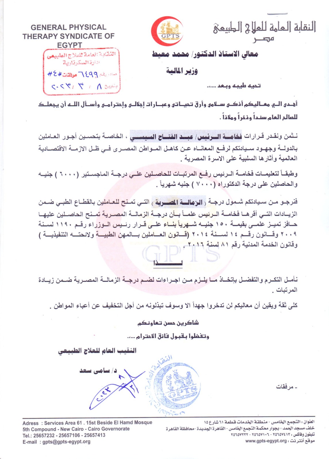 وناشد أمين صندوق النقابة العامة لأطباء العلاج الطبيعي، وزير المالية باتخاذ ما يلزم من إجراءات لضم درجة الزمالة المصرية ضمن زيادة المرتبات.