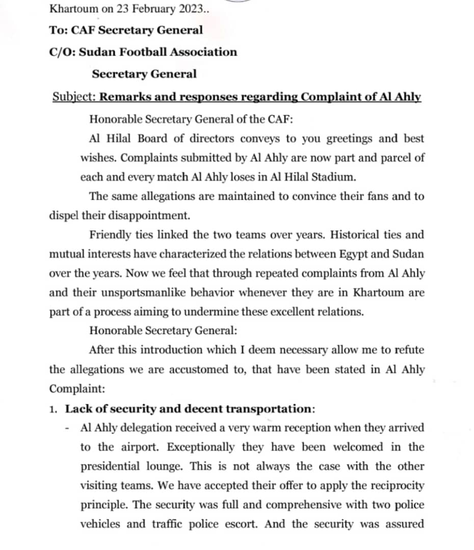 وجاء نص شكوى الهلال السوداني كالتالي: معالي الأمين العام للاتحاد الإفريقي لكرة القدم، ينقل مجلس إدارة الهلال إليكم تحياتي وأطيب التمنيات. أصبحت الشكاوى المقدمة من قبل الأهلي الآن جزءًا لا يتجزأ من كل مباراة يخسرها الأهلي على ملعب الهلال، تم الحفاظ على نفس المزاعم لإقناع معجبيهم وتبديد خيبة أملهم.