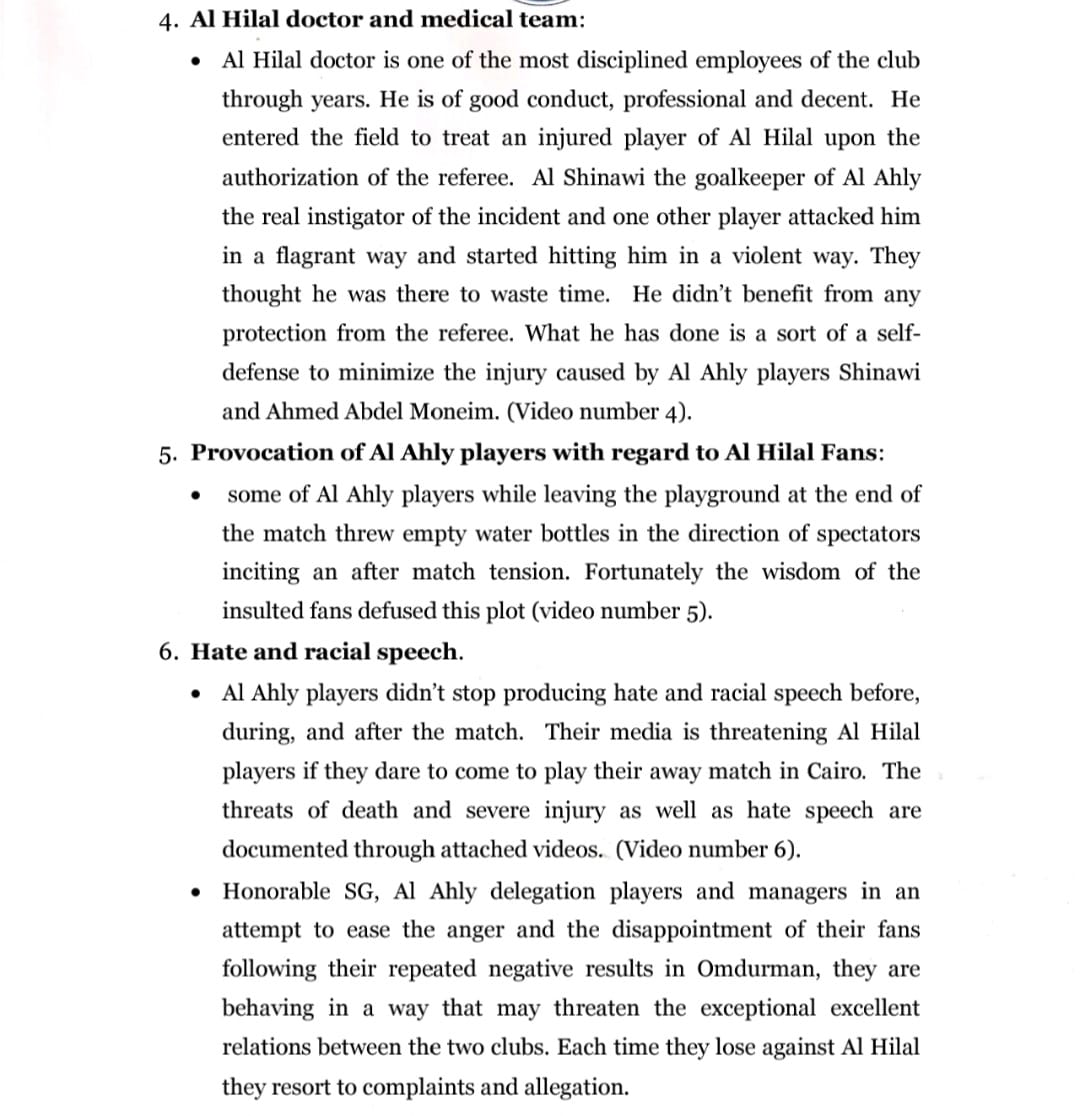 واختتم الهلال نص شكواه للاتحاد الإفريقي: الشرفاء لاعبو ومدراء النادي الأهلي الكرام في محاولة لتخفيف غضب وخيبة أمل جماهيرهم بعد النتائج السلبية المتكررة في أم درمان، يتصرفون بطريقة قد تهدد العلاقات الممتازة الاستثنائية بين الناديين، في كل مرة يخسرون فيها أمام الهلال يلجؤون إلى الشكاوى والادعاءات.