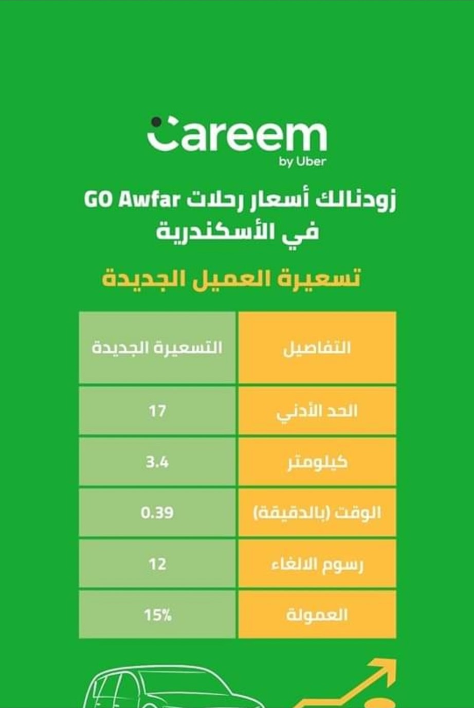 وفيما يتعلق برحلات Go Awfar، بلغ الحد الأدنى للرحلة 19 جنيهًا، وتكلفة الكيلو متر المقطوع 3.3 جنيه، ودقيقة الانتظار بـ0.43 جنيه، ورسوم إلغاء الرحلة 15 جنيهًا؛ والعمولة المستقطعة من السائقين 15%.