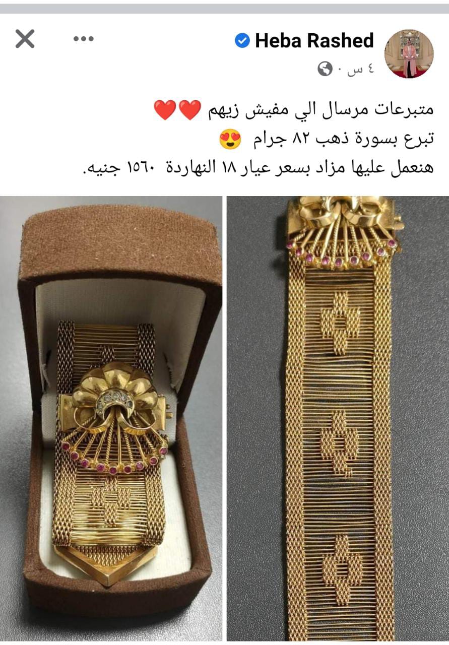 وقالت هبة راشد مؤسسة مرسال على صفحتها الشخصية بموقع التواصل الاجتماعي فيسبوك: متبرعات مرسال اللي مفيش زيهم، تبرع بسوار ذهب 82 جراما، هنعمل عليه مزاد بسعر عيار 18 النهاردة 1560 جنيها.
