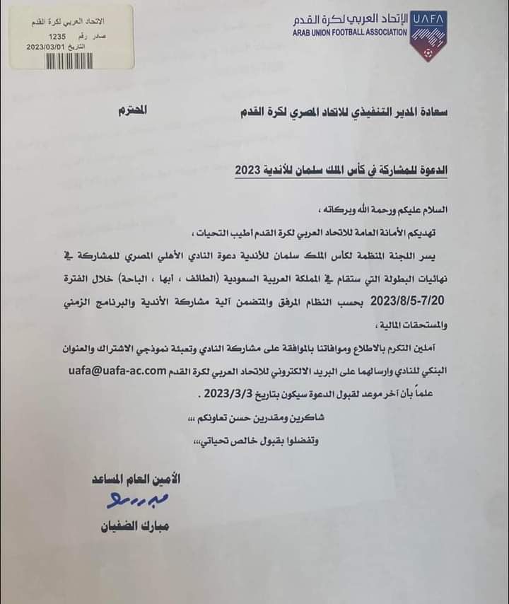 تفاصيل خطاب دعوة الأهلي للمشاركة في البطولة العربية