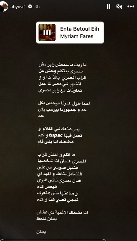 واختتم أبيوسف حديثه عن سبب اختياره لأغنية أنت بتقول إيه لميريام فارس في خاصية الاستوري، حيث قال: أنا مشغلك الأغنية دي عشان يمكن تتعظ يمكن.