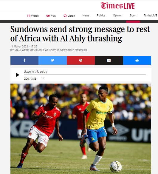 قالت صيحفة timeslive الجنوب إفريقية، إن صن داونز يبعث رسالة لبقية قارة إفريقيا بفوزه على الأهلي بخماسية في مباراة اليوم.