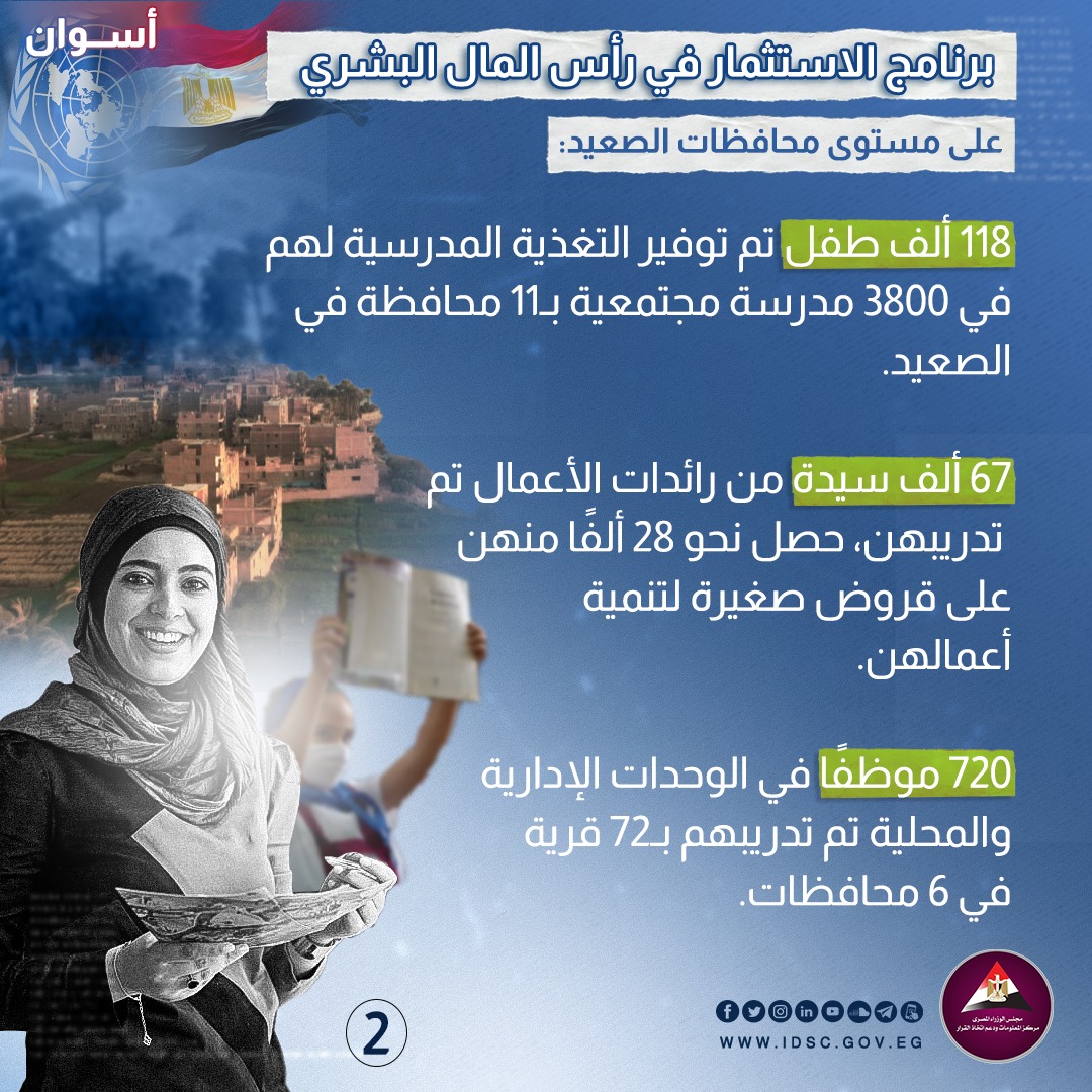 سلط مركز معلومات مجلس الوزراء الضوء، على نتائج برنامج الاستثمار في رأس المال البشري، موضحا أنه تم توفير التغذية المدرسية لـ 118 ألف طفل في 3800 مدرسة مجتمعية بـ 11 محافظة في الصعيد.