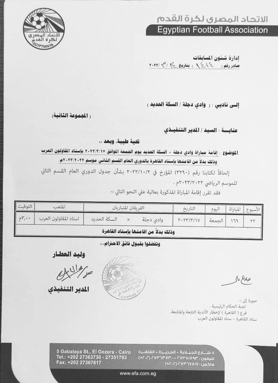 قررت لجنة المسابقات بالاتحاد المصري لكرة القدم بنقل مباراة الفريق الأول الكروي بنادي وادي دجلة مع نظيرة فريق السكة الحديد، الى استاد المقاولون العرب بدلًا من إقامتها على استاد القاهرة.