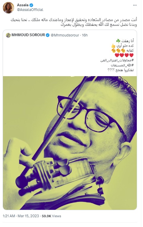 أعلن عازف الكمان الشهير محمود سرور، رغبته في الاعتزال النهائي للفن والموسيقي، فيما تدخلت الفنانة السورية أصالة وعلقت على هذا القرار.