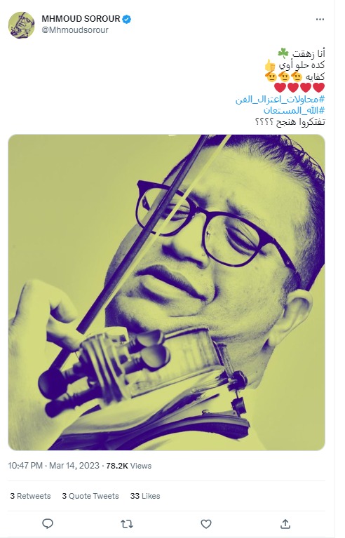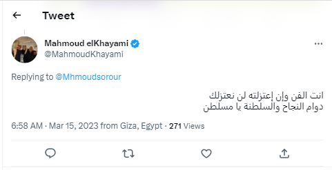فيما علق الملحن محمود الخيامي، أيضًا على منشور محمود سرور، حيث كتب: أنت الفن وإن اعتزلته لن نعتزلك دوام النجاح والسلطنة يا مسلطن.