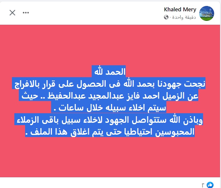 وقال ميري، خلال منشور له عبر صفحته الرسمية على موقع التواصل الاجتماعي، فيس بوك: الحمد لله، نجحت جهودنا بحمد الله فى الحصول على قرار بالإفراج عن الزميل أحمد فايز عبدالمجيد عبدالحفيظ، حيث سيتم إخلاء سبيله خلال ساعات، وبإذن الله ستتواصل الجهود لإخلاء سبيل باقى الزملاء المحبوسين احتياطيا حتى يتم إغلاق هذا الملف.