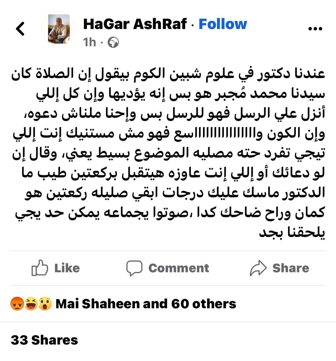 وكتبت الفتاة على حسابها: عندنا دكتور في علوم شبين الكوم بيقول إن الصلاة كان سيدنا محمد مُجبر هو بس إنه يؤديها وإن كل اللي أنزل على الرسل فهو للرسل بس، وإحنا ملناش دعوة، وإن الكون واسع فهو مش مستنيك إنت إللي تيجي تفرد حته مصلية، الموضوع بسيط يعني، وقال إن لو دعائك أو إللي إنت عاوزه هيتقبل بركعتين، طيب ما الدكتور ماسك عليك درجات إبقى صلي له ركعتين هو كمان وراح ضاحك كدا، صوتوا ياجماعة يمكن حد ييجي يلحقنا بجد.