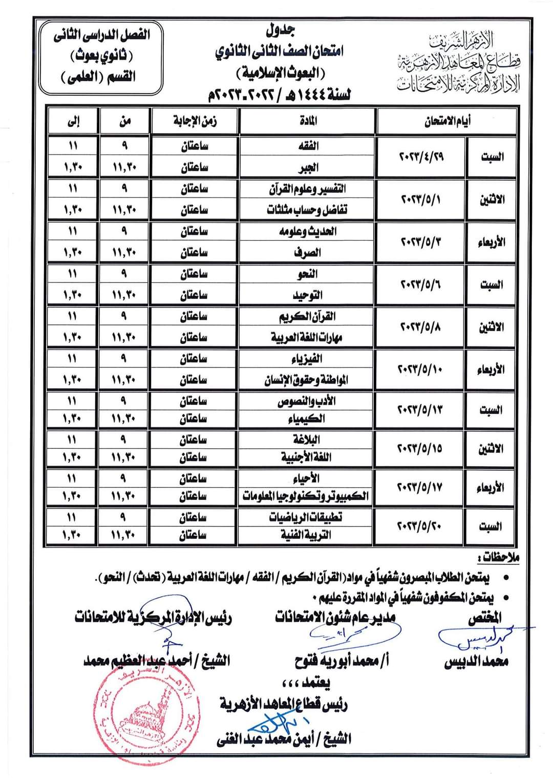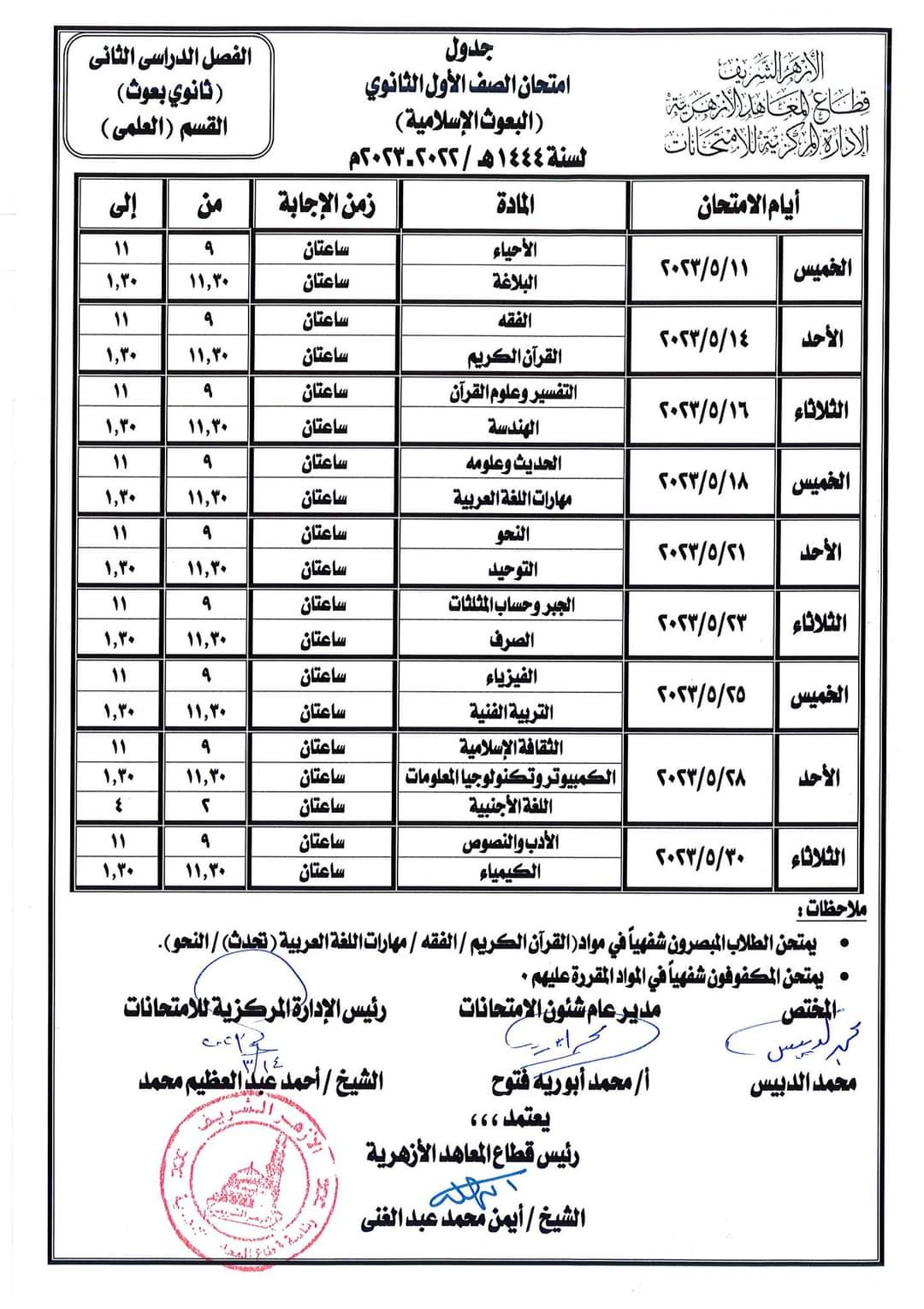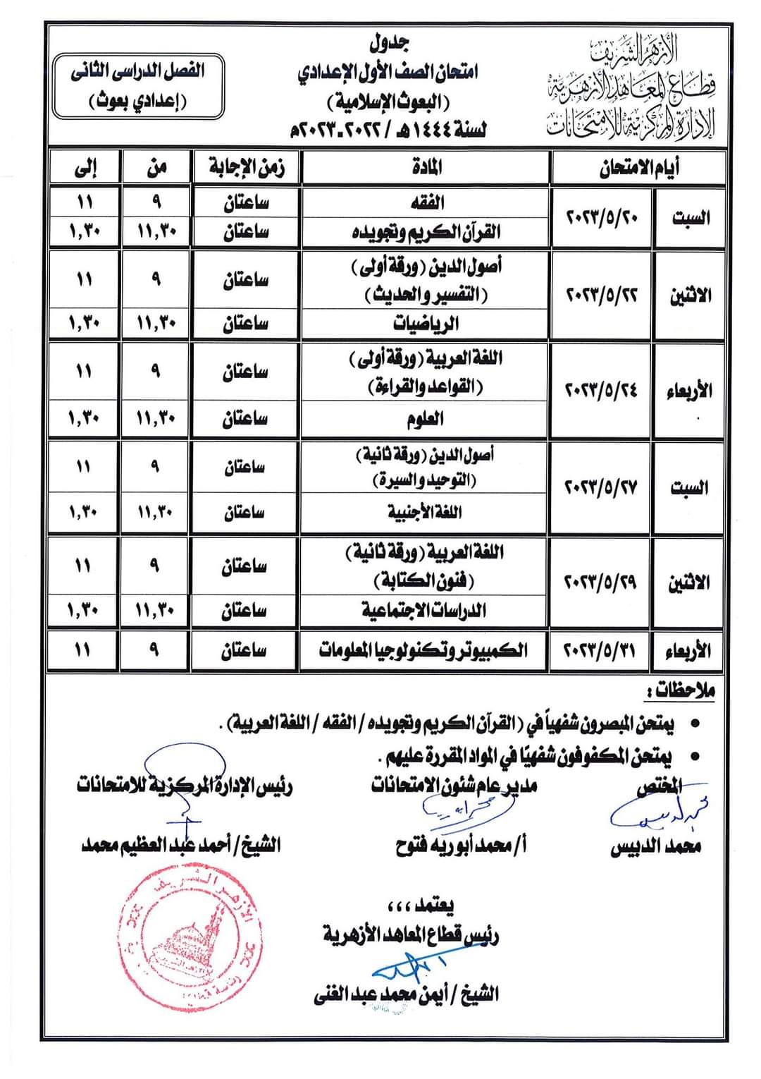 أعلن قطاع المعاهد الأزهرية جداول امتحانات الفصل الدراسي الثاني النسخة المعتمدة للمرحلة الابتدائية والإعدادية والثانوية الأزهرية، والقراءات البعوث وطلاب البرنامج التأهيلي الأزهرية للعام الدراسي 2022/ 2023.