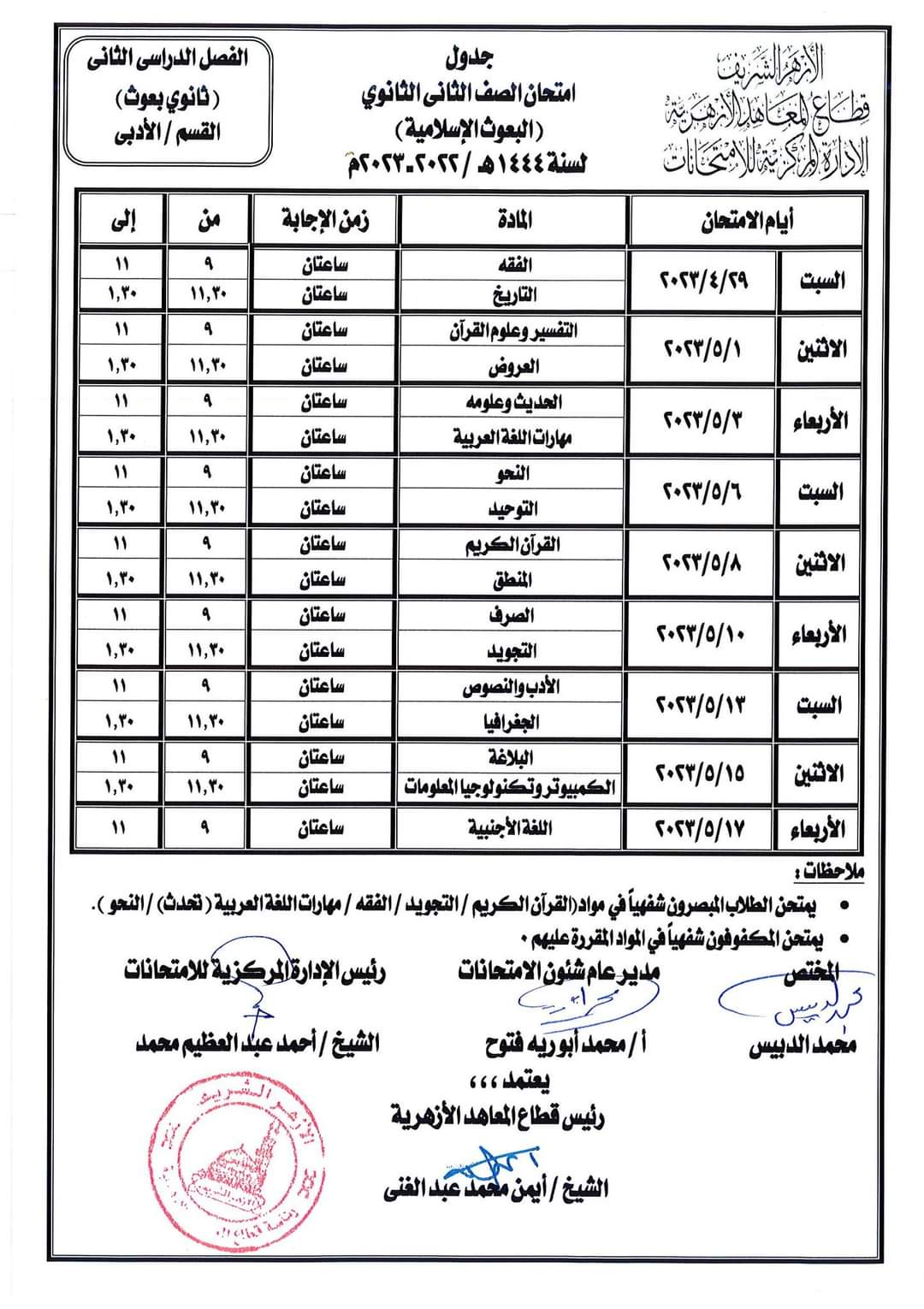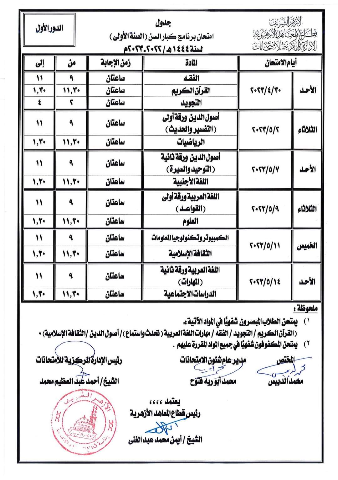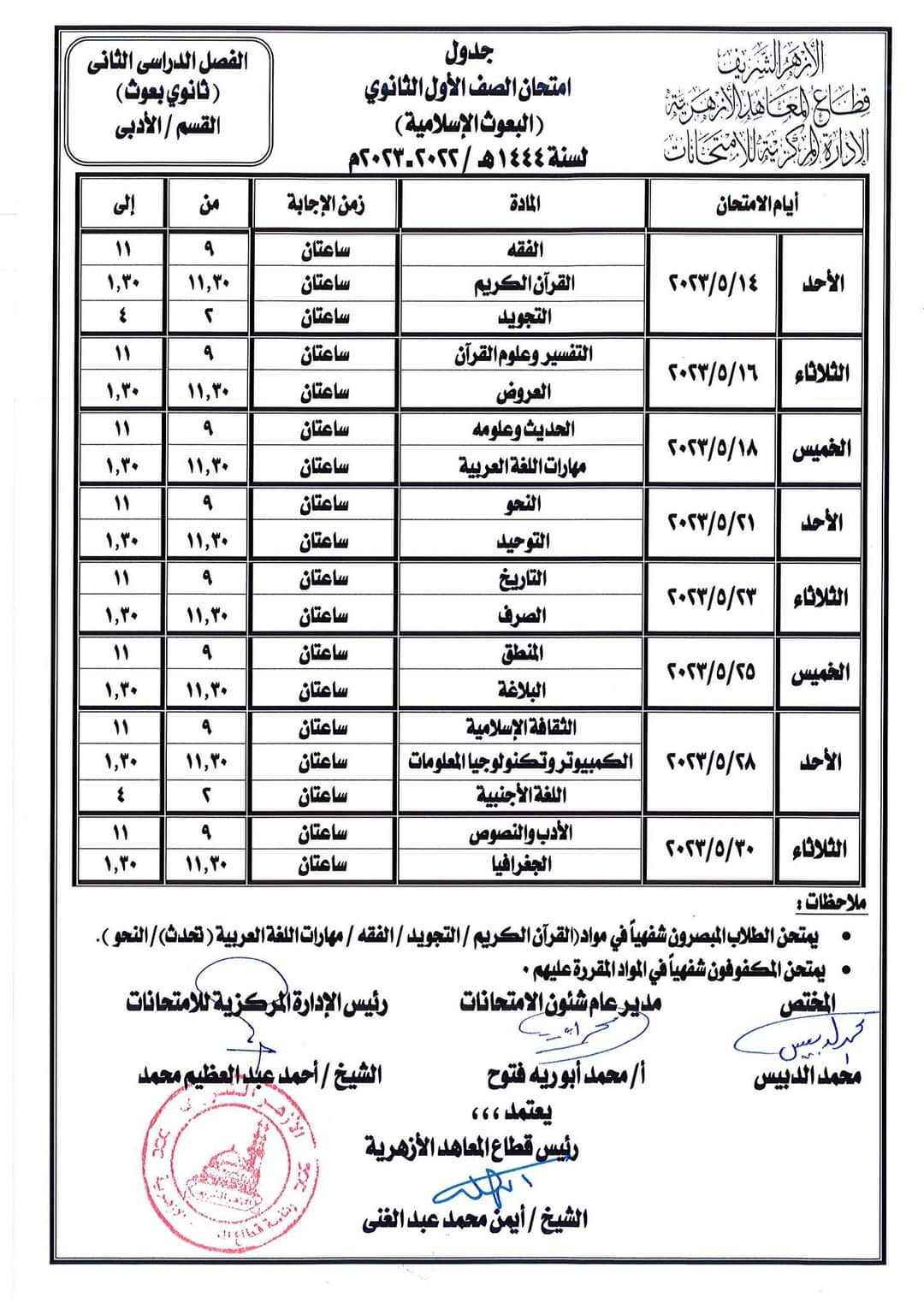 أعلن قطاع المعاهد الأزهرية جداول امتحانات الفصل الدراسي الثاني النسخة المعتمدة للمرحلة الابتدائية والإعدادية والثانوية الأزهرية، والقراءات البعوث وطلاب البرنامج التأهيلي الأزهرية للعام الدراسي 2022/ 2023.