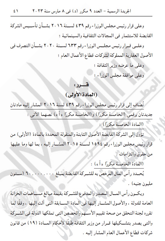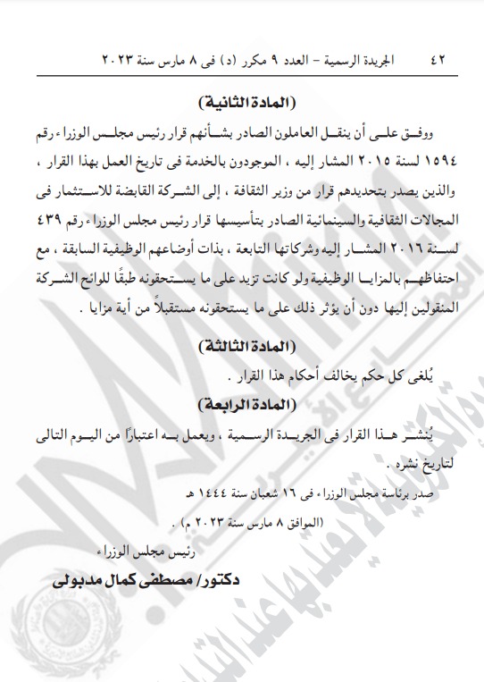 نشرت الجريدة الرسمية في عددها الصادر رقم 9 مكرر “د” في 16 مارس سنة 2023، قرارات جديدة لـ رئيس مجلس الوزراء أبرزها بشأن تعديل بعض أحكام قرار رئيس مجلس الوزراء رقم 439 لسنة 2019 بشأن تأسيس الشركة القابضة للاستثمار في المجالات الثقافية والسينمائية والموافقة على نقل بعض العاملين إلى الشركة.