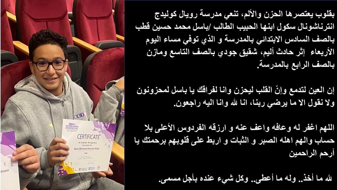 ونشرت المدرسة الخاصة بالطفل نعي قائلة: بقلوب يعصرها الحزن والألم تنعى مدرسة رويال كوليدج ابنها الحبيب الطالب باسل محمد قطب بالصف السادس الابتدائي والذي توفي إثر حادث أليم مساء الأربعاء.