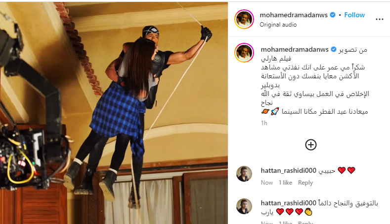 ونشر محمد رمضان، الصورة عبر حسابه الشخصي بموقع انستجرام، وعلق عليها، قائلًا: من تصوير فيلم هارلي، شكرًا مي عمر على إنك نفذتي مشاهد الأكشن معايا بنفسك دون الاستعانة بدوبلير.
