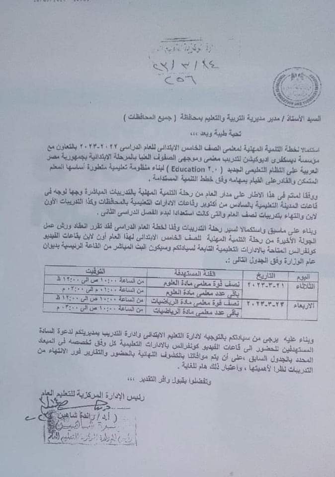 وجهت وزارة التربية والتعليم والتعليم الفني، خطابًا لجميع مديري مديريات التربية والتعليم والتعليم الفني، بشأن تدريب معلمي الصف الخامس الابتدائي في مادتي العلوم والرياضيات.