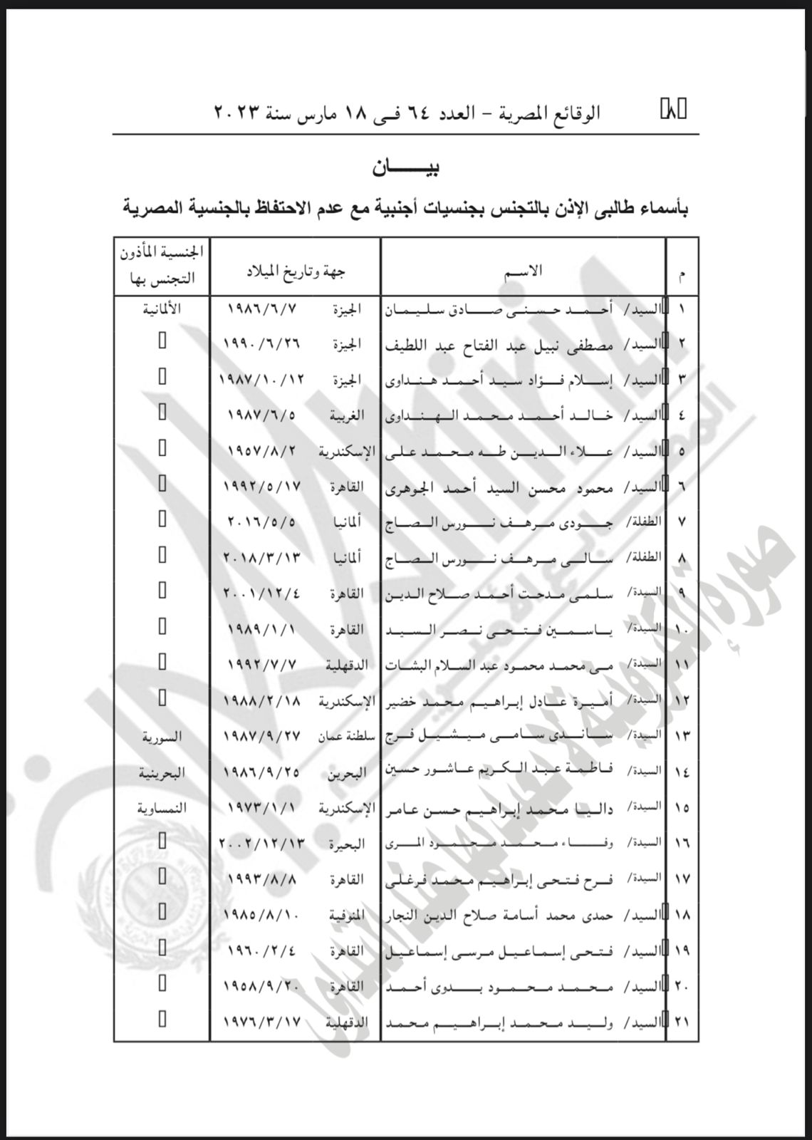 ونصت المادة الأولى على أن يُؤذن لكل من 63 مواطنا أولهم أحمد هشام عبد الحكيم محمد عثمان وآخرهم عمر خالد محمد شعبان، المدرجة أسماؤهم بالبيان المرفق بالتجنس بالجنسية الأجنبية الموضحة قرين اسم كل منهم، مع احتفاظهم بالجنسية المصرية.