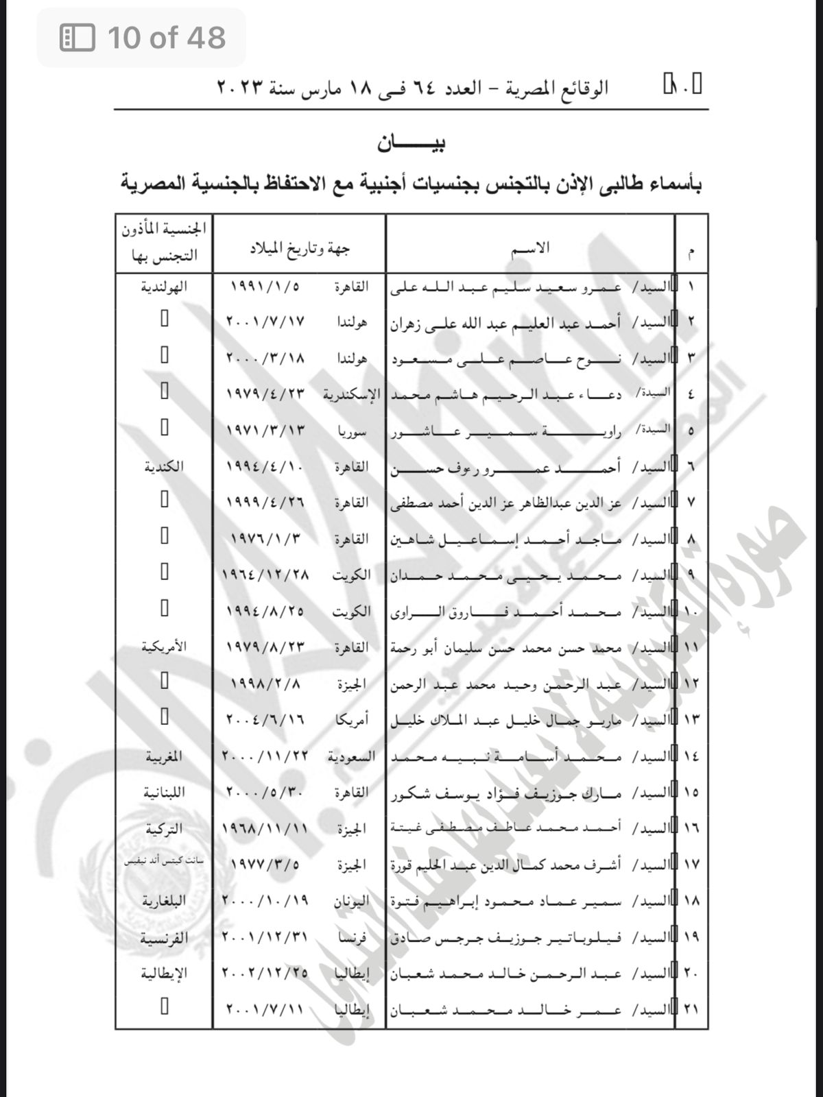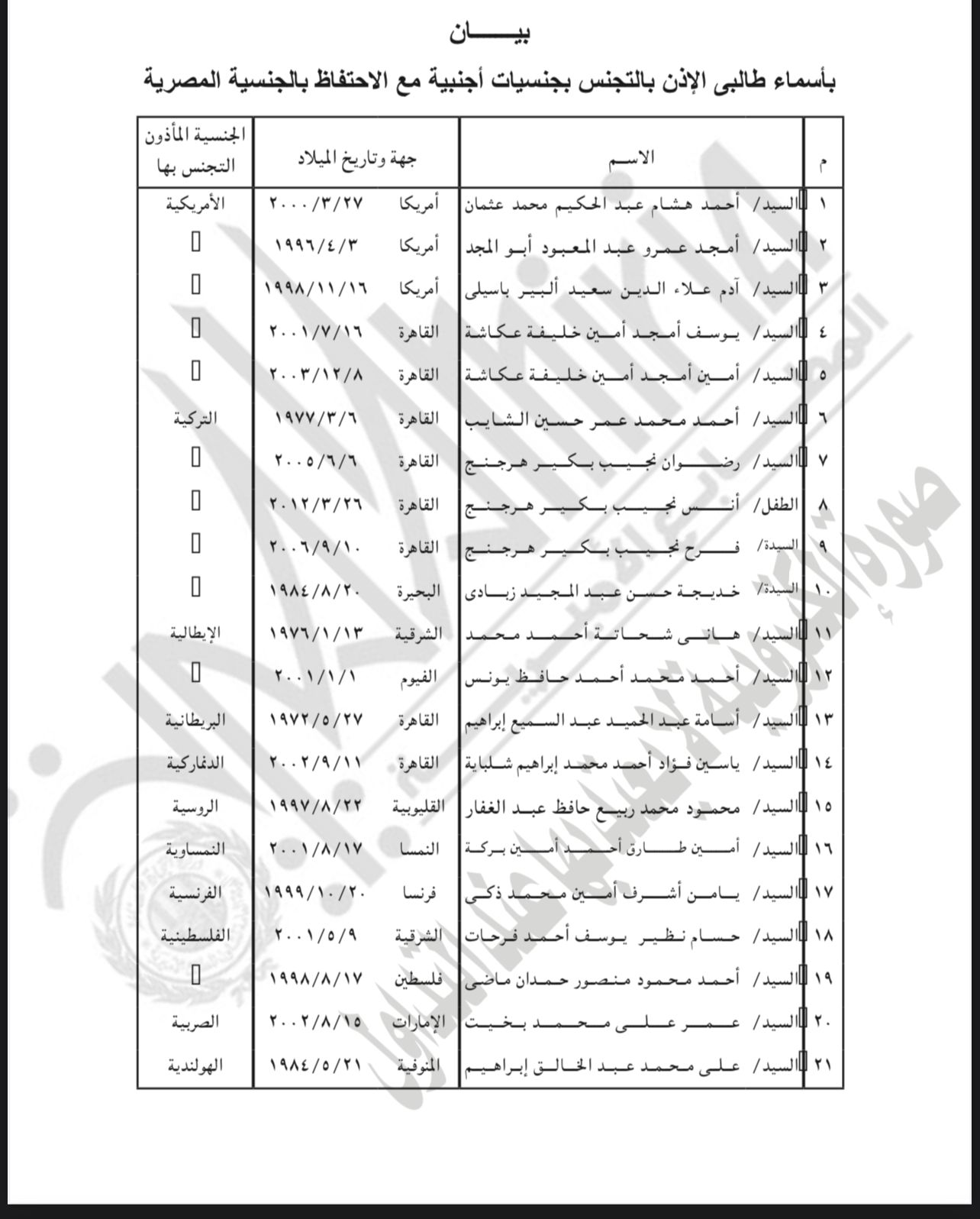 نشرت الجريدة الرسمية قرار جديد لوزير الداخلية اللواء محمود توفيق، والذي يحمل رقم 390 لسنة 2023، بشأن المواطنين راغبين الجنسية الجنبية مع الاحتفاظ بالمصرية.