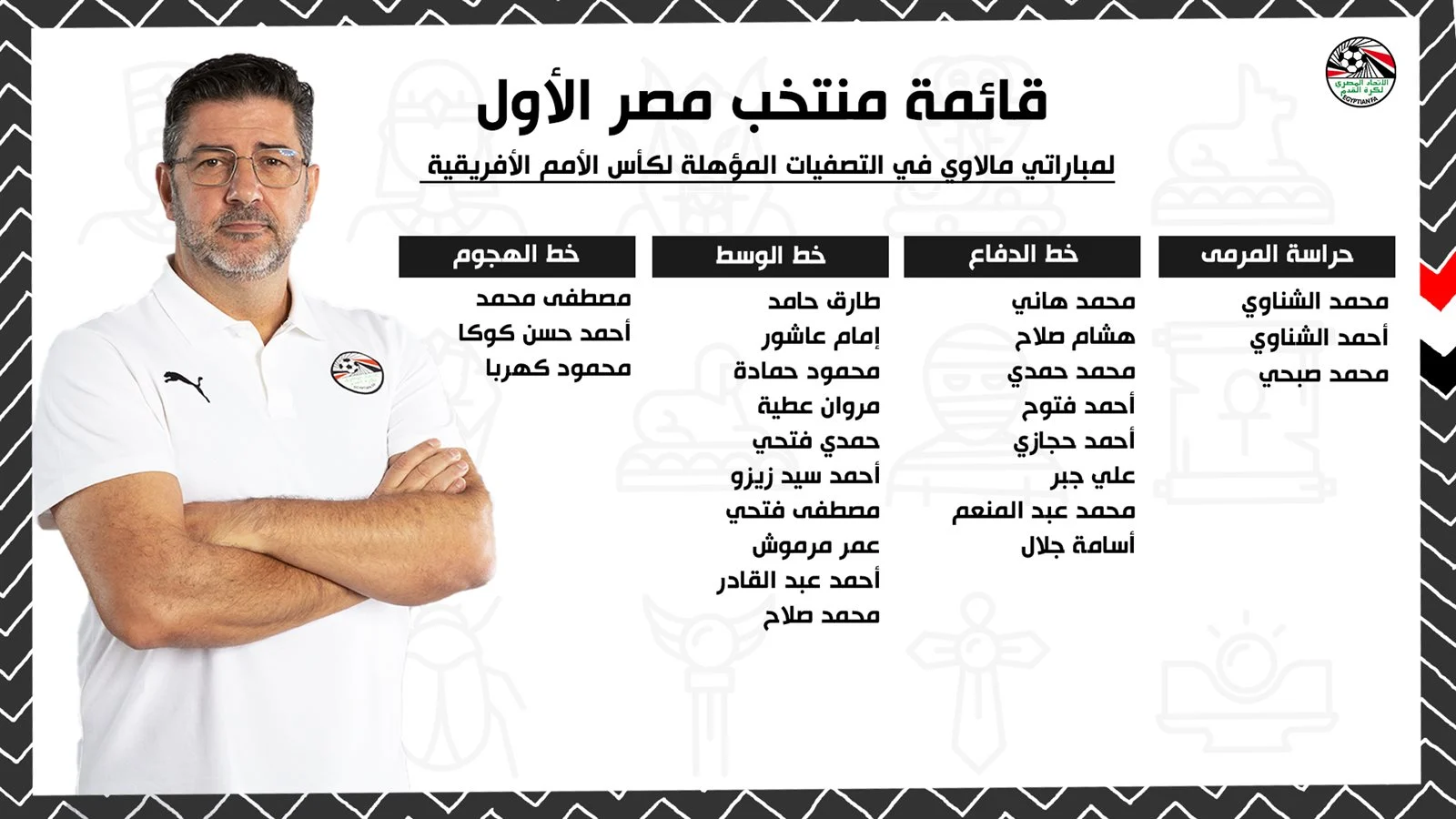 وأعلن البرتغالي روي فيتوريا المدير الفني لمنتخب مصر، أمس، قائمة الفراعنة لمعسكر مباراتي مالاوي، وضمت القائمة 24 لاعبًا محترفين بأندية خارجية.