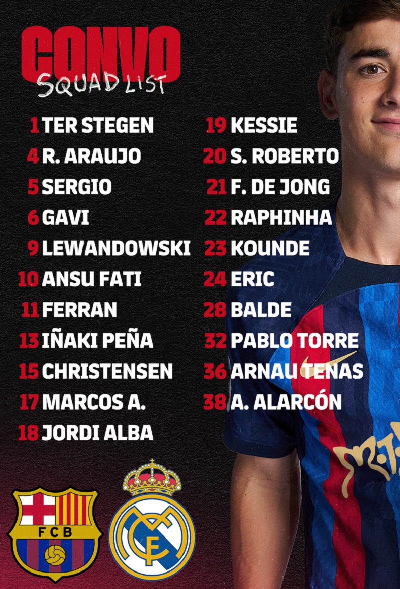 كشف الجهاز الفني لبارسا بقيادة المدرب تشافي هيرنانديز عن قائمة اللاعبين المشاركة في مواجهة الكلاسيكو اليوم، ومن القائمة قد يختار المدرب الإسباني تشكيل برشلونة التالي: