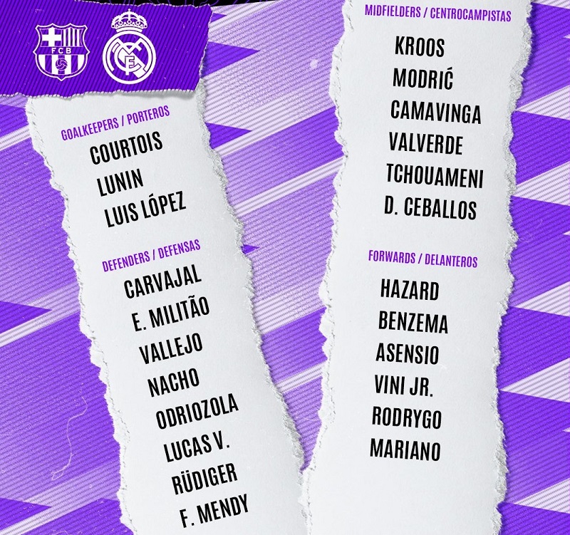 أعلن الجهاز الفني للريال بقيادة المدرب الإيطالي كارلو أنشيلوتي عن قائمة اللاعبين المشاركة في مواجهة الكلاسيكو اليوم، ومن القائمة قد يختار المدرب تشكيل ريال مدريد التالي: