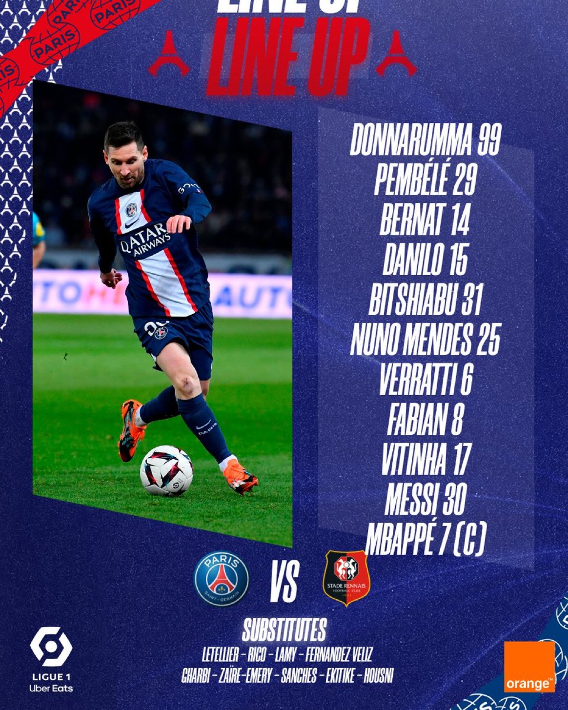 قرر المدرب جالتييه أن يدخل مباراة فريقه لمواجهة رين بالدوري الفرنسي، بالتشكيل الآتي: