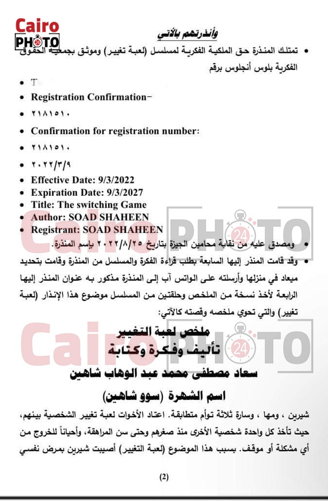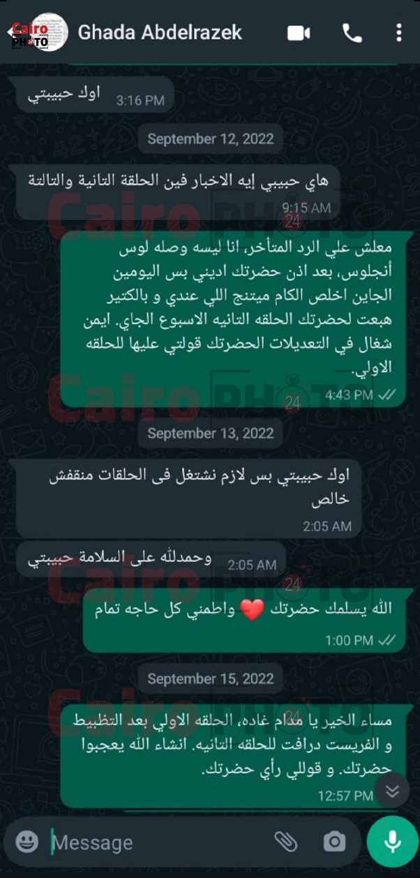 وحصل القاهرة 24 على مستند إنذار سو شاهين، لصناع مسلسل تلت التلاتة، هذا بجانب بعض الرسائل التي دارت بين سو وغادة عبد الرازق، بالإضافة إلى شكوى أخرى قدمتها للفنان أشرف زكي، نقيب المهن التمثيلية ضد غادة، من أجل الحصول على حقوقها.