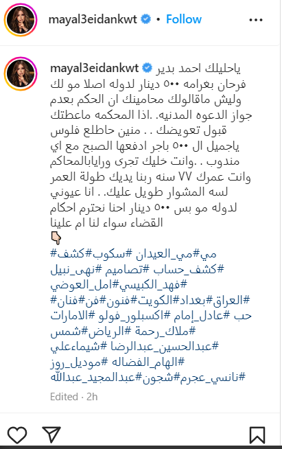 وعلقت الإعلامية مي العيدان، على حكم تغريمها لصالح الفنان أحمد بدير، حيث قالت عبر حسابها الشخصي بموقع تبادل الصور والفيديوهات انستجرام: ياحليلك أحمد بدير فرحان بغرامة 500 دينار لدولة أصلا مو لك وليش ماقالولك محامينك إن الحكم بعدم جواز الدعوة المدنية إذا المحكمة ماعطتك قبول تعويضك.